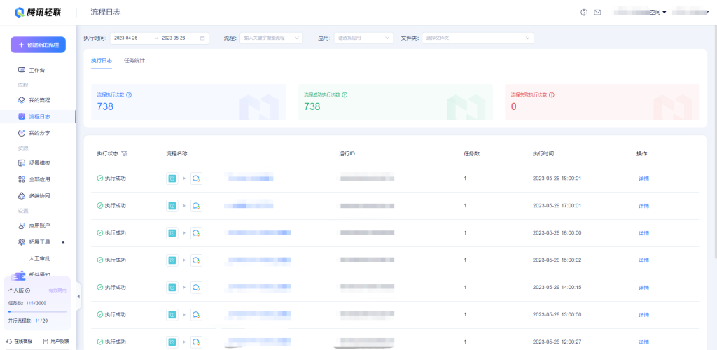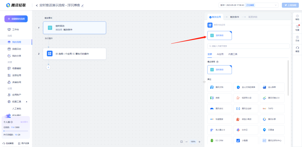 配置好相关参数后即可上线流程,腾讯轻联有不同的套餐版本,免费版以及收费版不同之处详见:应用与数据集成收费标准 - 腾讯轻联 (tencent.com)