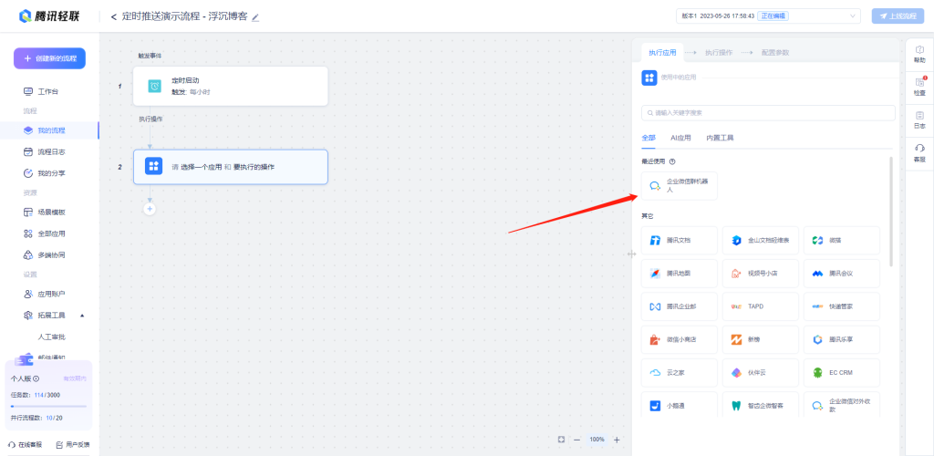 我们就以腾讯轻联的企业微信群机器人定时推送消息为例,因为我工作中常用到的就是定时推送消息,其他玩法请自行探索