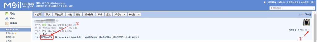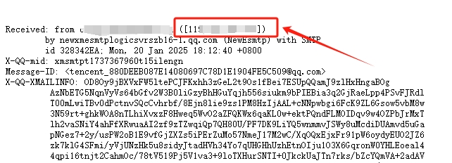 以网页版 QQ 邮箱为例,打开邮件点击右上角的箭头下拉,显示邮件原文 ,在邮件原文中,就可以找到发件人的 IP 地址,“Received: from”后面所带的地址就是发件人的 IP 地址,以上通过邮件查源 IP 只适用于对方使用 个人邮箱 发信,其余无效。