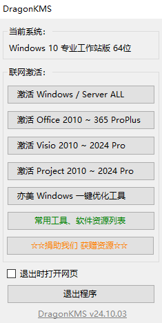 使用 MicroKMS 神龙版能激活 Win11、Win10、Win8/8.1、Win7 以及 Win Server 2022/2019/2016/2012/2008 等系统版本,其中包括:专业工作站版、企业版、专业版、教育版、专业教育版、家庭版、核心版、中文版(OEM 预装系统版本)、单语言版等,同时支持激活 Office 365/2024/2021/2019/2016/2013/2010 Proplus、Visio 2021/2019/2016/2013/2010 Pro、Project 2021/2019/2016/2013/2010 Pro