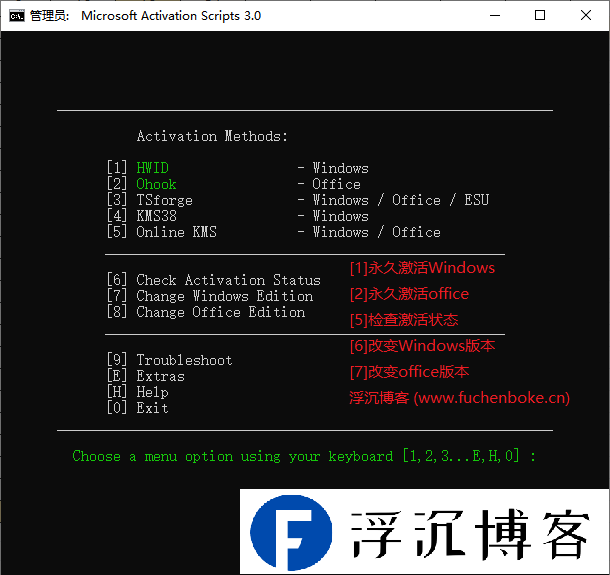 3、如下图会有几列激活选项,输入数字“1”进行 Windows 激活,输入数字“2”进行 Office 激活,其他选项等已经汉化在图中。